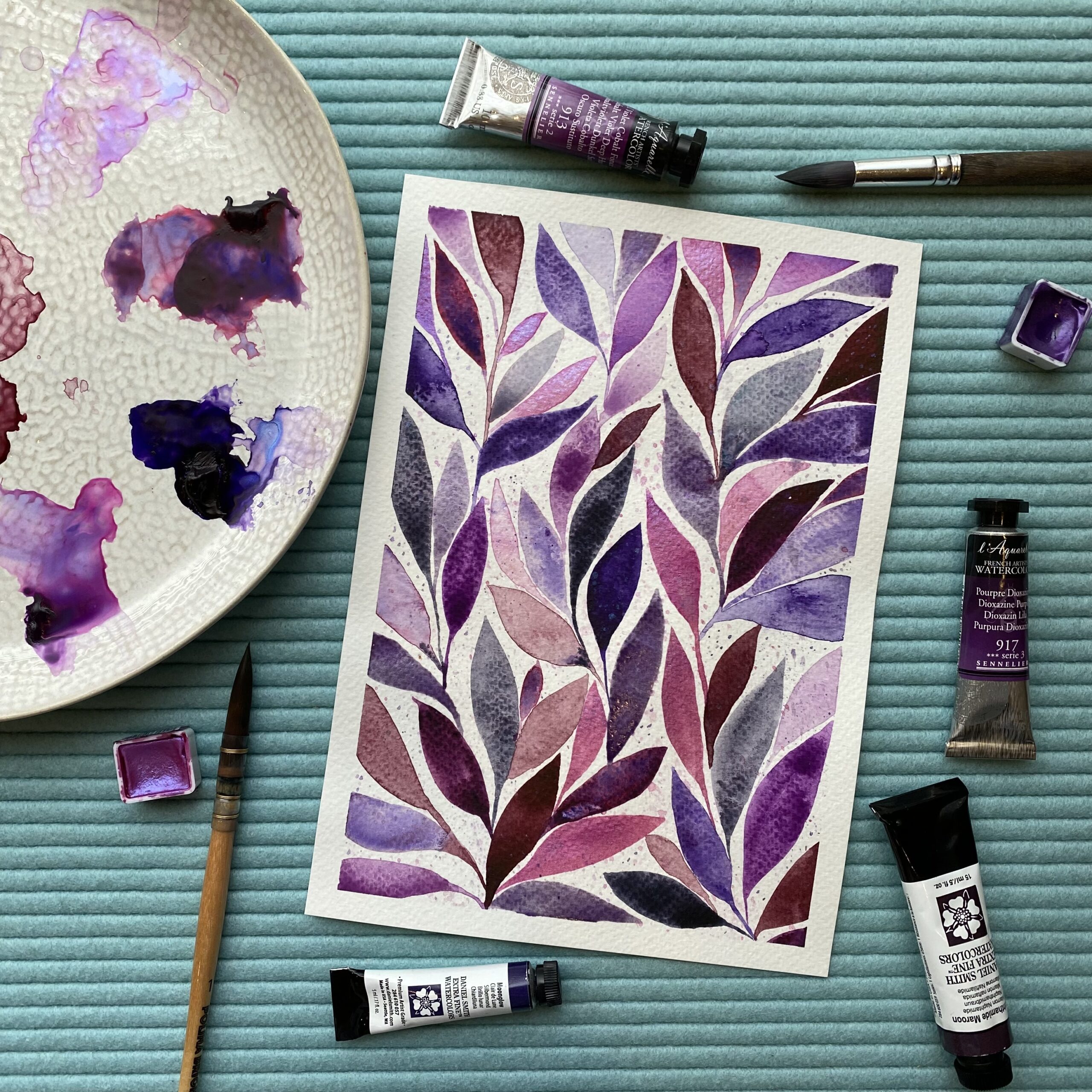 Watercolour leaf pattern in shades of purple. Printed on high quality Hahnemühle FineArt paper.